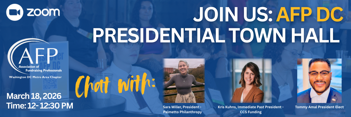 ![]() Join AFP DC President Sarah Miller, Immediate Past President Kris Kuhns, and President-Elect Tommy Amal for an open and engaging virtual Town Hall designed exclusively for our members. This 30‑minute informal conversation is your space to: > Ask questions about the chapter, AFP membership, or the fundraising profession > Share what’s on your mind - ideas, challenges, and opportunities > Provide feedback that helps shape the chapter’s direction > Learn more about AFP DC’s priorities and leadership updates > Connect with fellow members in a relaxed, welcoming environment There is no formal agenda, just an open opportunity to engage directly with chapter leaders, strengthen community, and ensure your voice is part of AFP DC’s future.